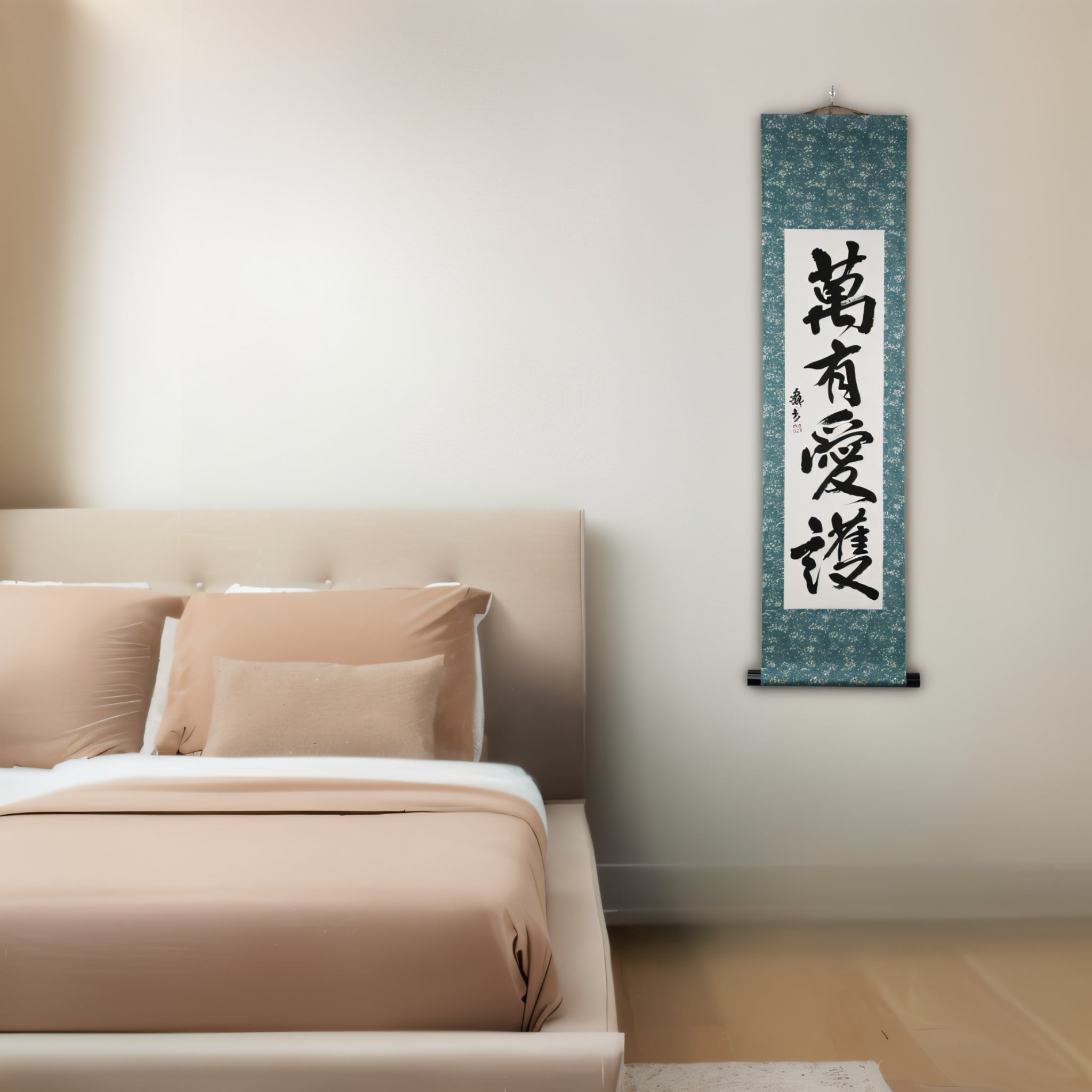 Ce rouleau de calligraphie japonaise présente la puissante phrase 萬有愛護 (Banyū Aigo), signifiant « Amour universel et protection ».