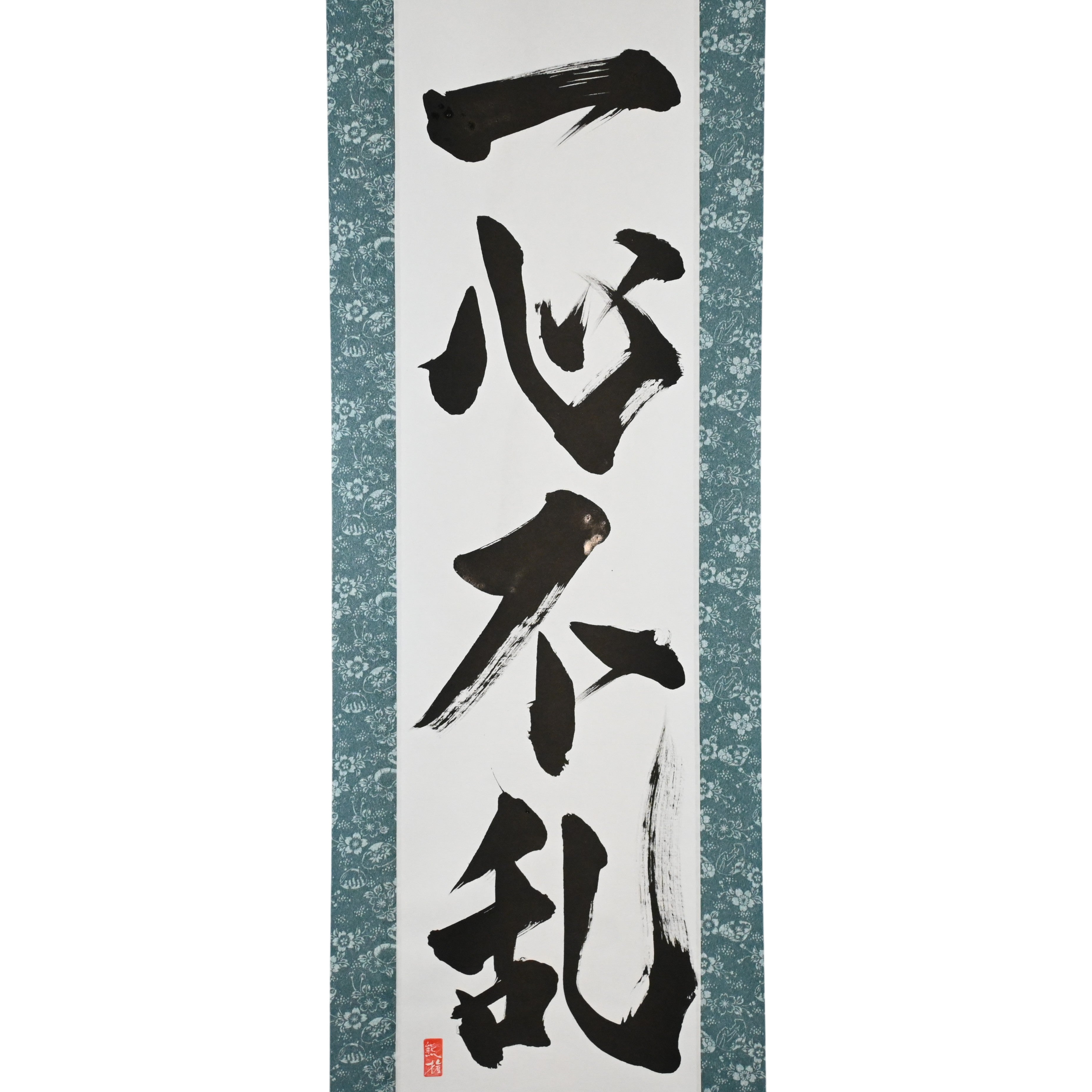 Ce rouleau de calligraphie japonaise présente la phrase puissante 一心不乱 (Isshin Furan), signifiant « concentration totale » ou « avec une dévotion sans partage ». Il capture l'état d'esprit essentiel des arts martiaux — la capacité à éliminer les distractions et à s'engager pleinement dans l'instant.
