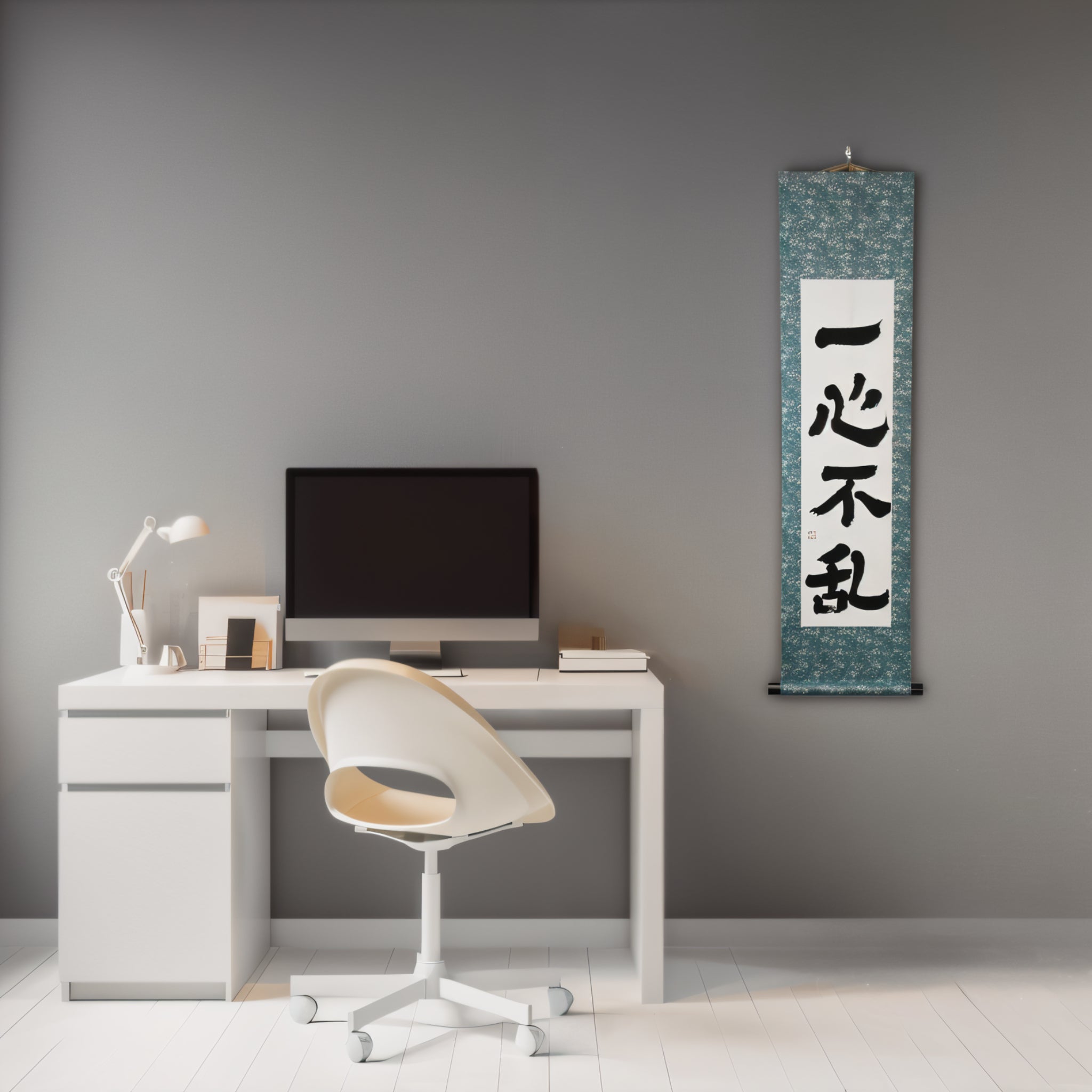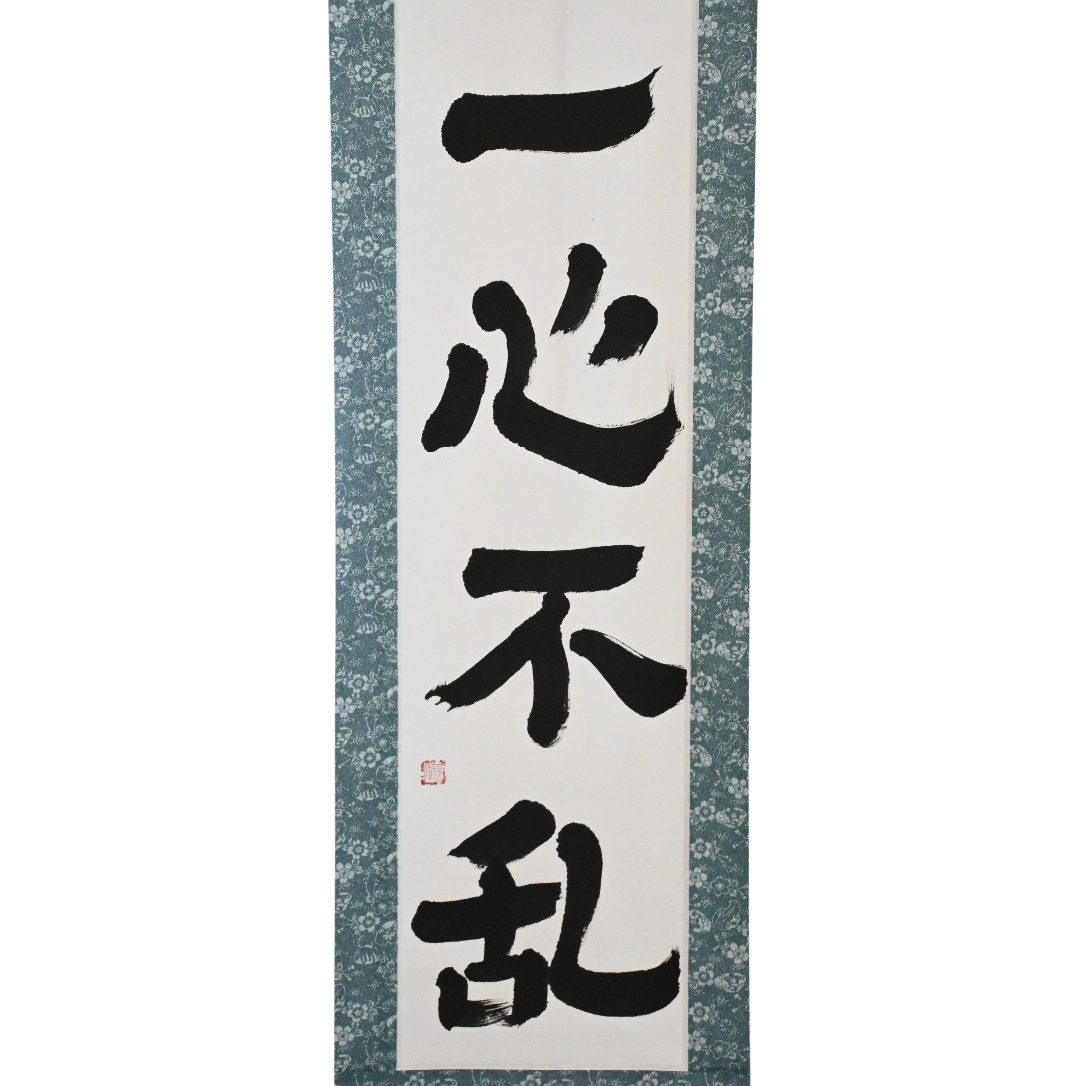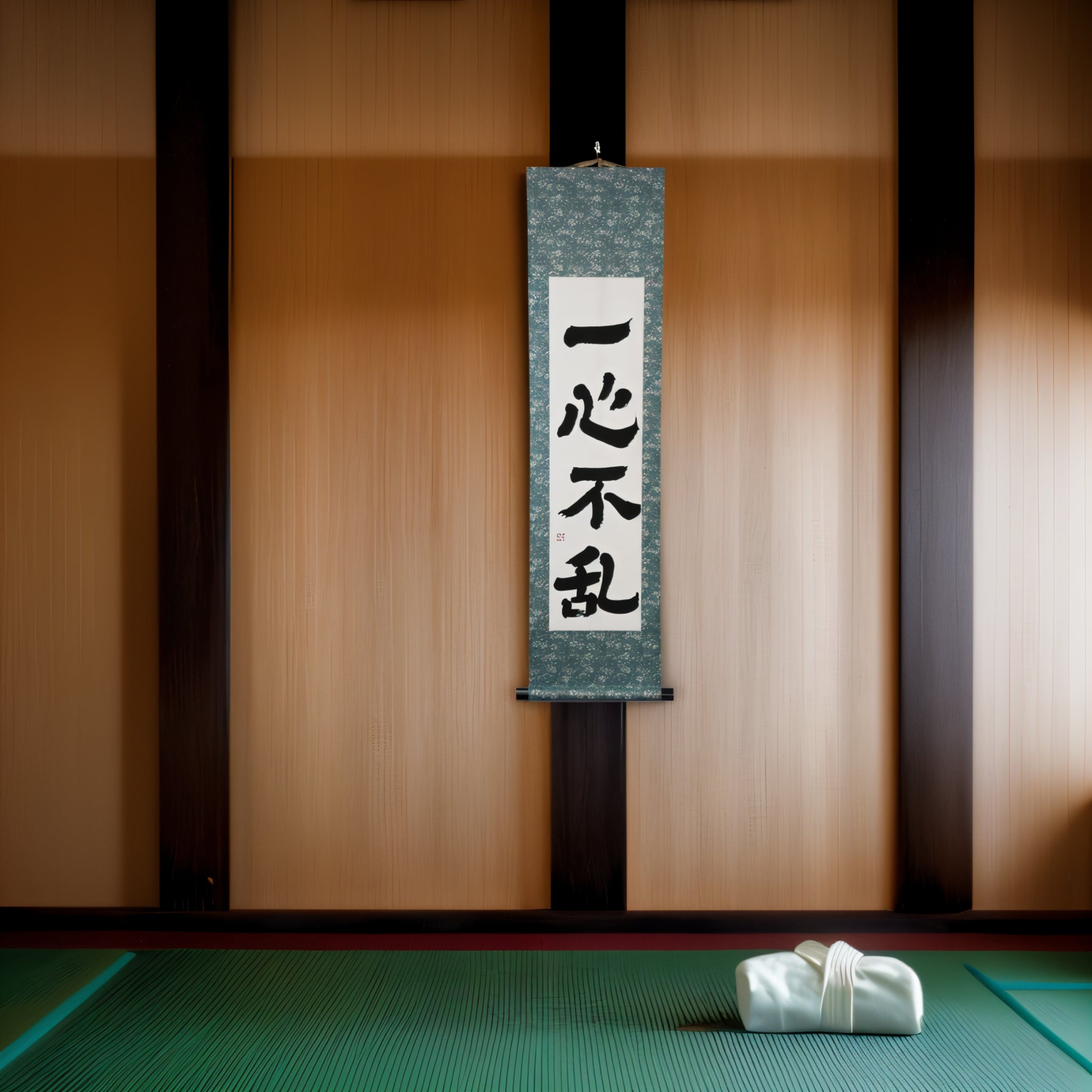 Ce rouleau de calligraphie japonaise présente la phrase puissante 一心不乱 (Isshin Furan), signifiant « concentration totale » ou « avec une dévotion sans partage ». Il capture l'état d'esprit essentiel des arts martiaux — la capacité à éliminer les distractions et à s'engager pleinement dans l'instant.