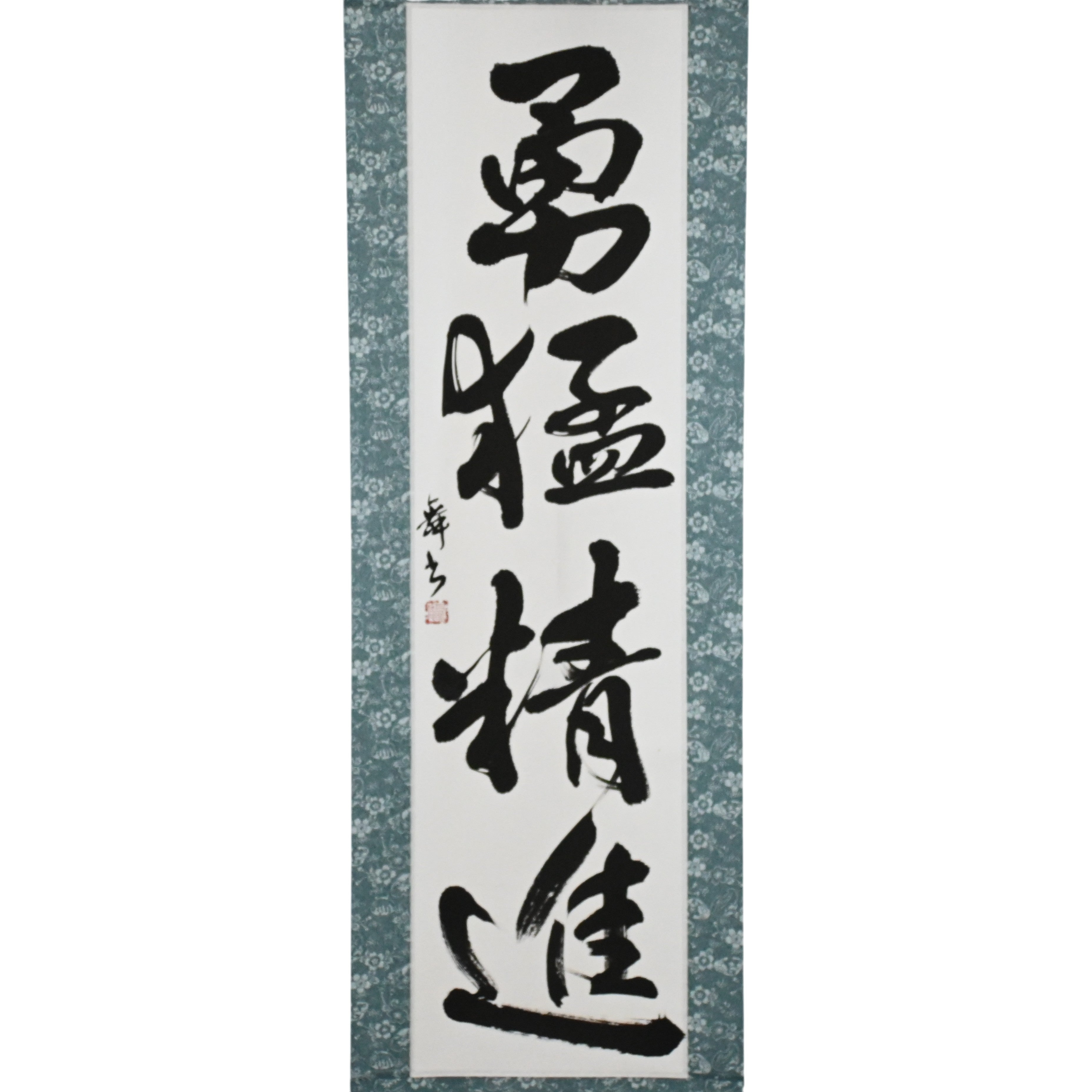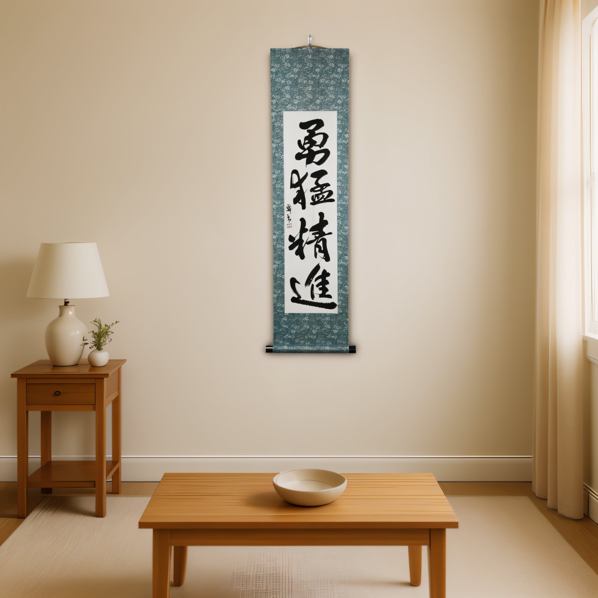 Ce rouleau de calligraphie japonaise présente la phrase puissante 勇猛精進 (Yūmō Shōjin) — exprimant une action courageuse et une persévérance disciplinée. Profondément enracinée dans la voie du Samouraï, elle reflète la détermination d'un Samouraï à affronter l'adversité sans peur et à se consacrer pleinement à l'auto-cultivation.