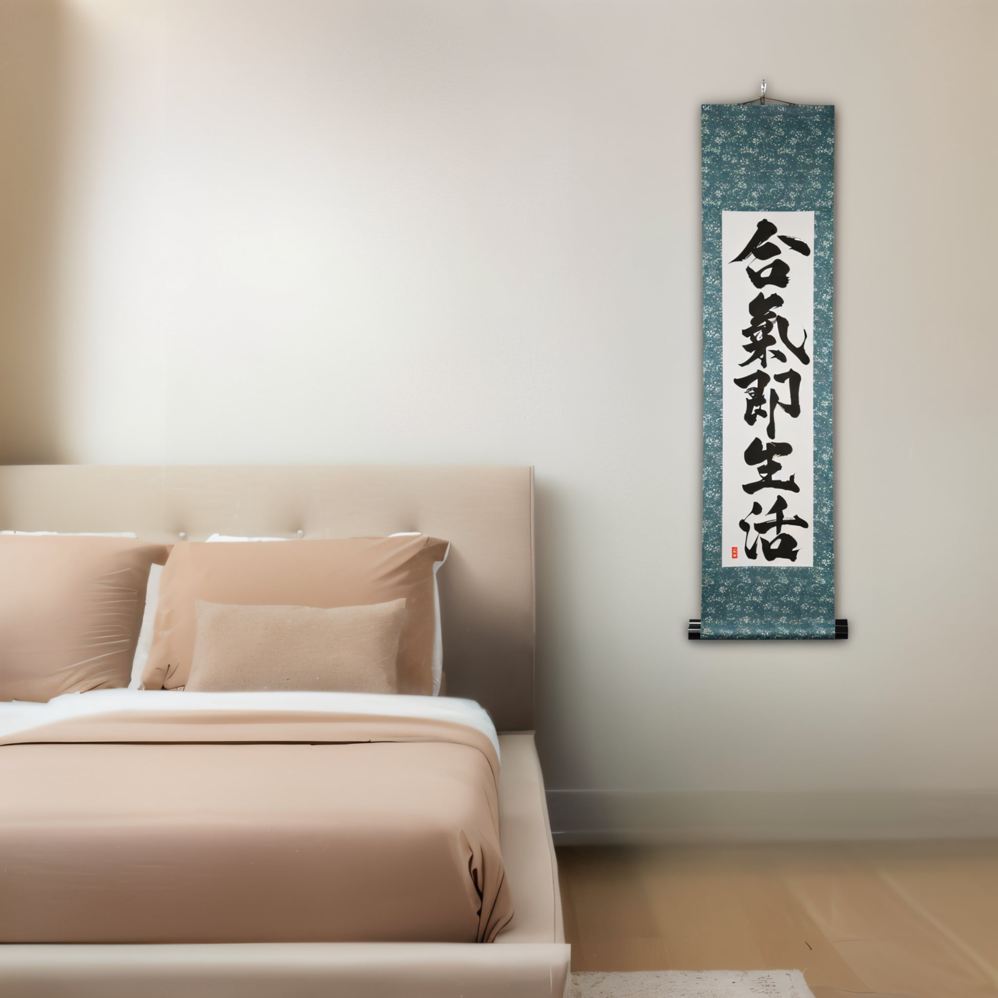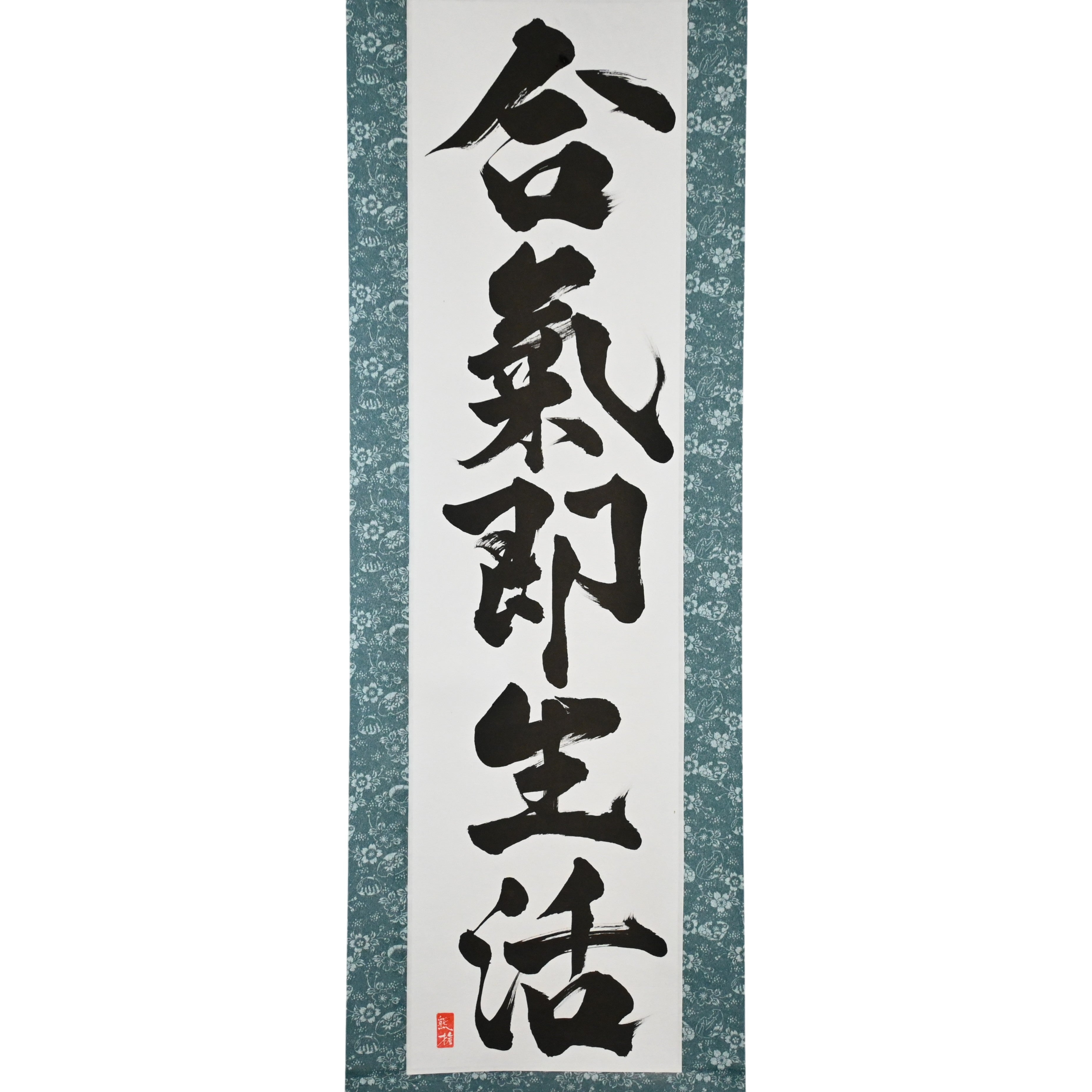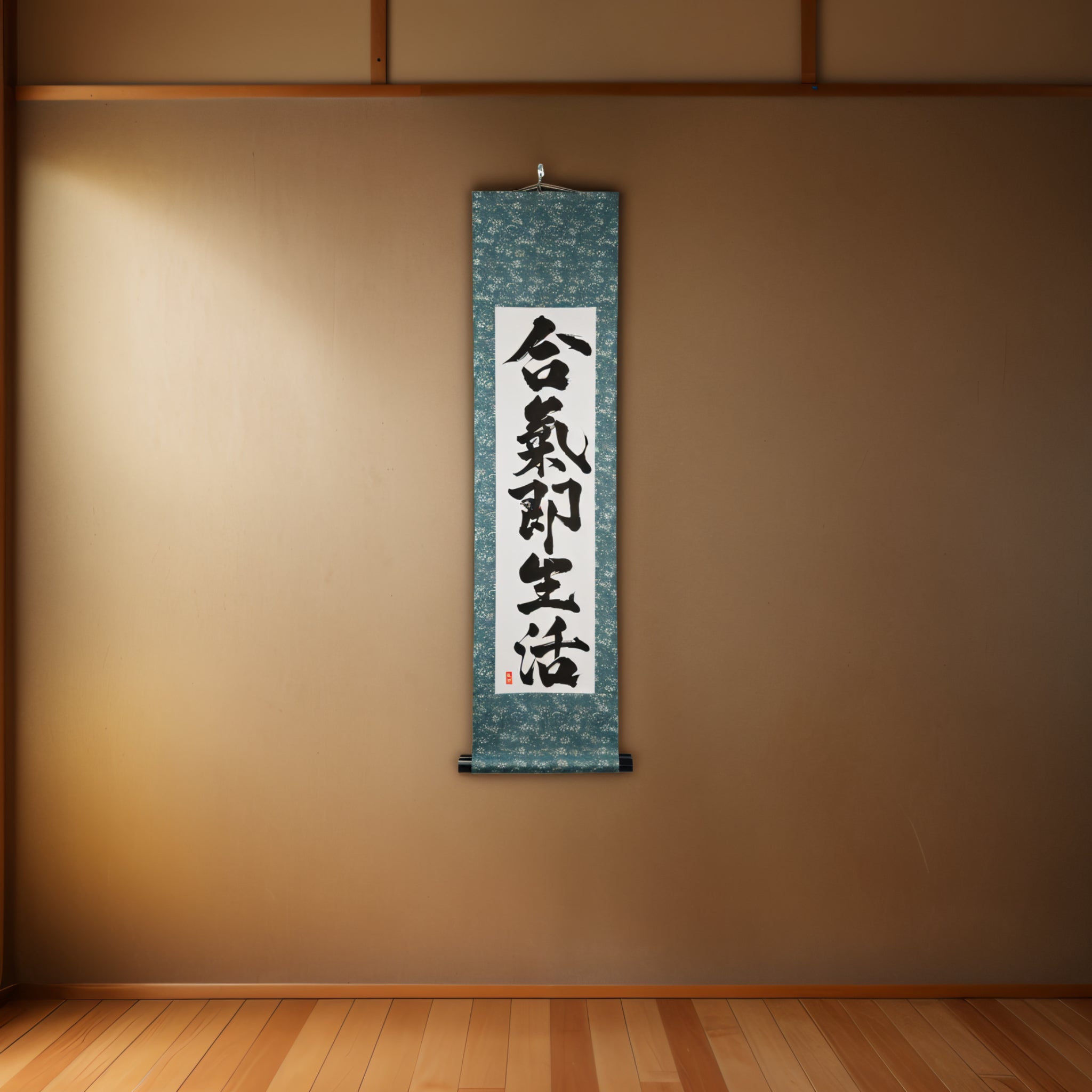 Ce rouleau de calligraphie japonaise présente la phrase profonde 合気即生活 (Aiki Soku Seikatsu) — « L'aïkido est la vie quotidienne ». Il exprime un principe fondamental de l'aïkido : cet art ne se limite pas au dojo, mais s'écoule à travers chaque instant de nos vies.