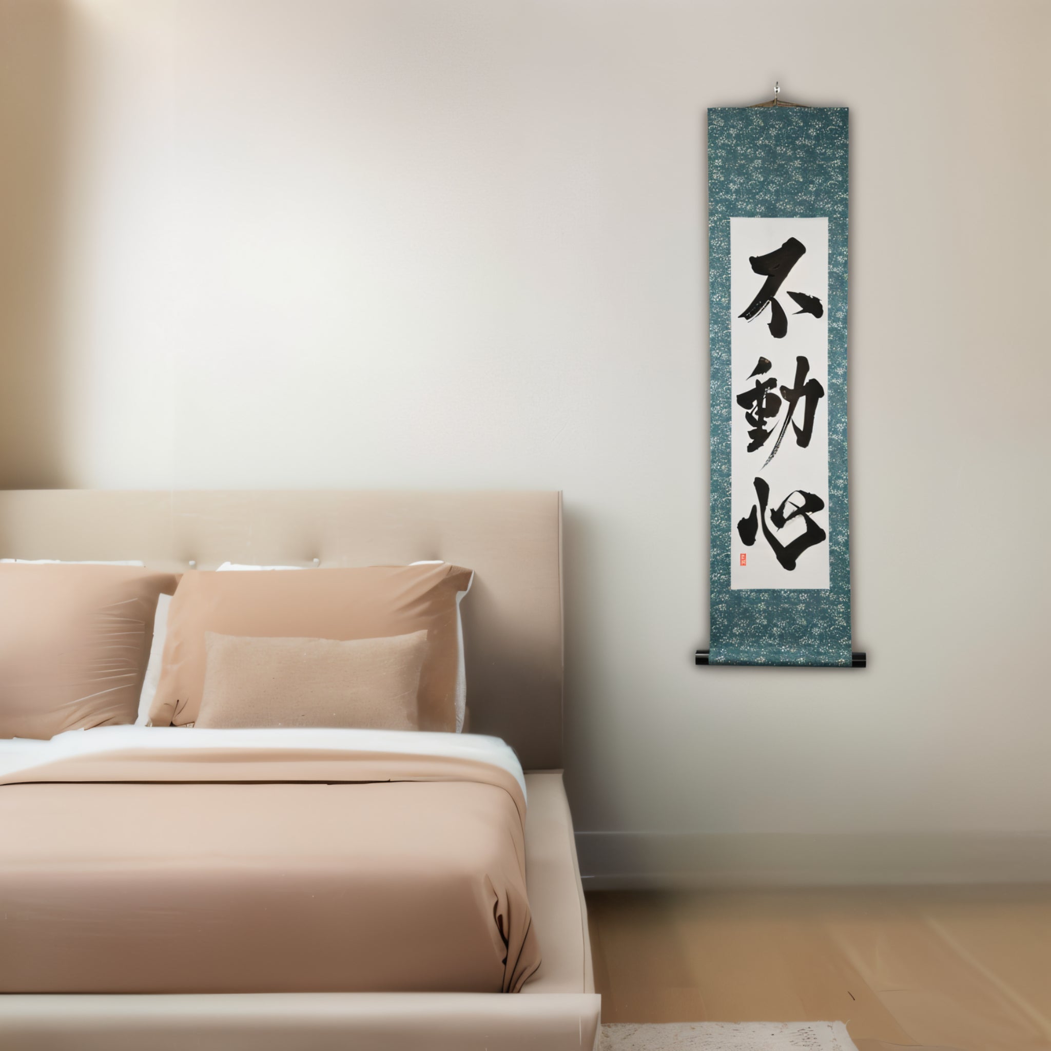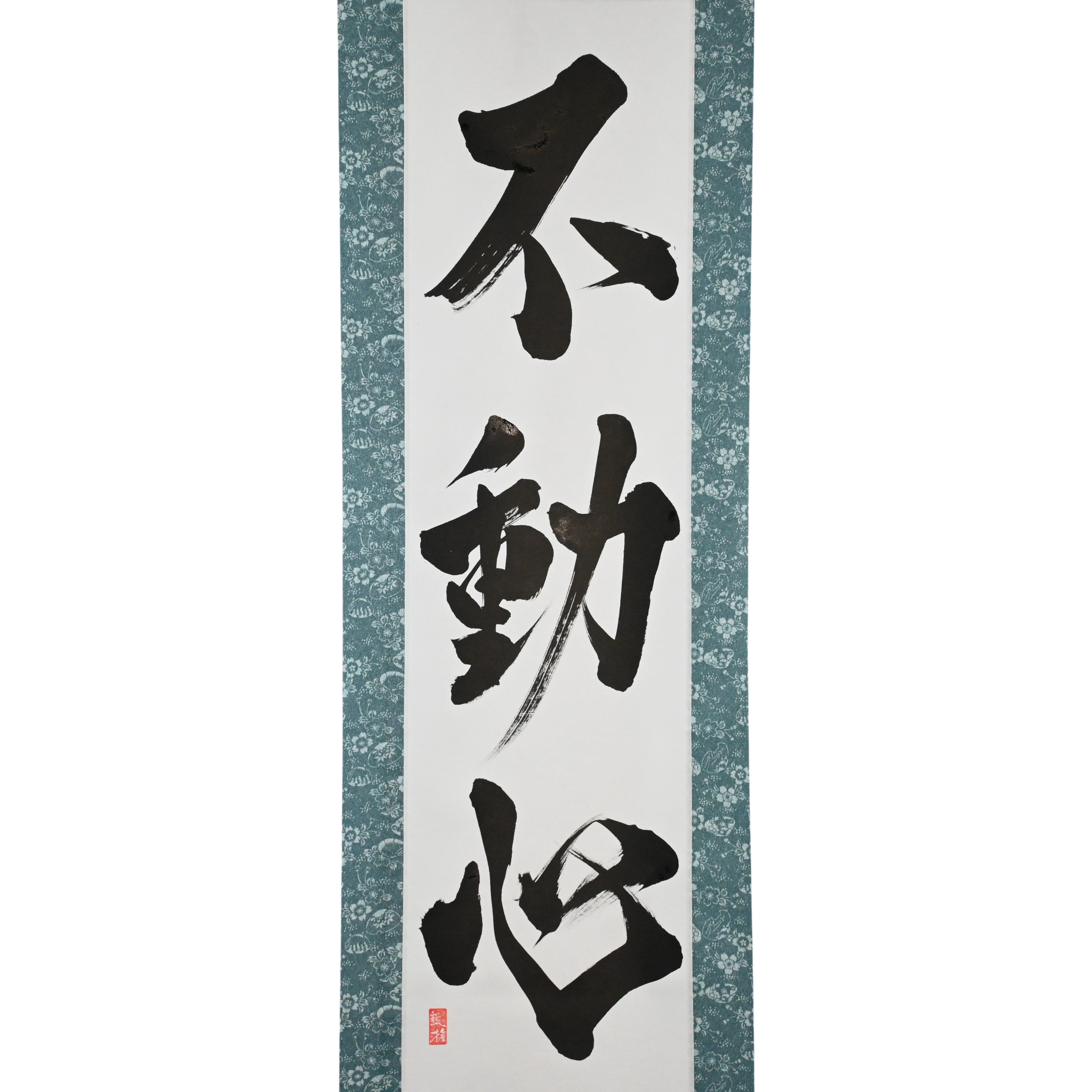 Ce rouleau de calligraphie présente le concept profond de 不動心 (Fudōshin) — « l'esprit immobile ». Il représente un état d'être calme et centré qui reste inébranlable face à la peur, la colère ou le doute. Dans les arts martiaux et la voie du Samouraï, le Fudōshin est considéré comme essentiel à la véritable maîtrise.