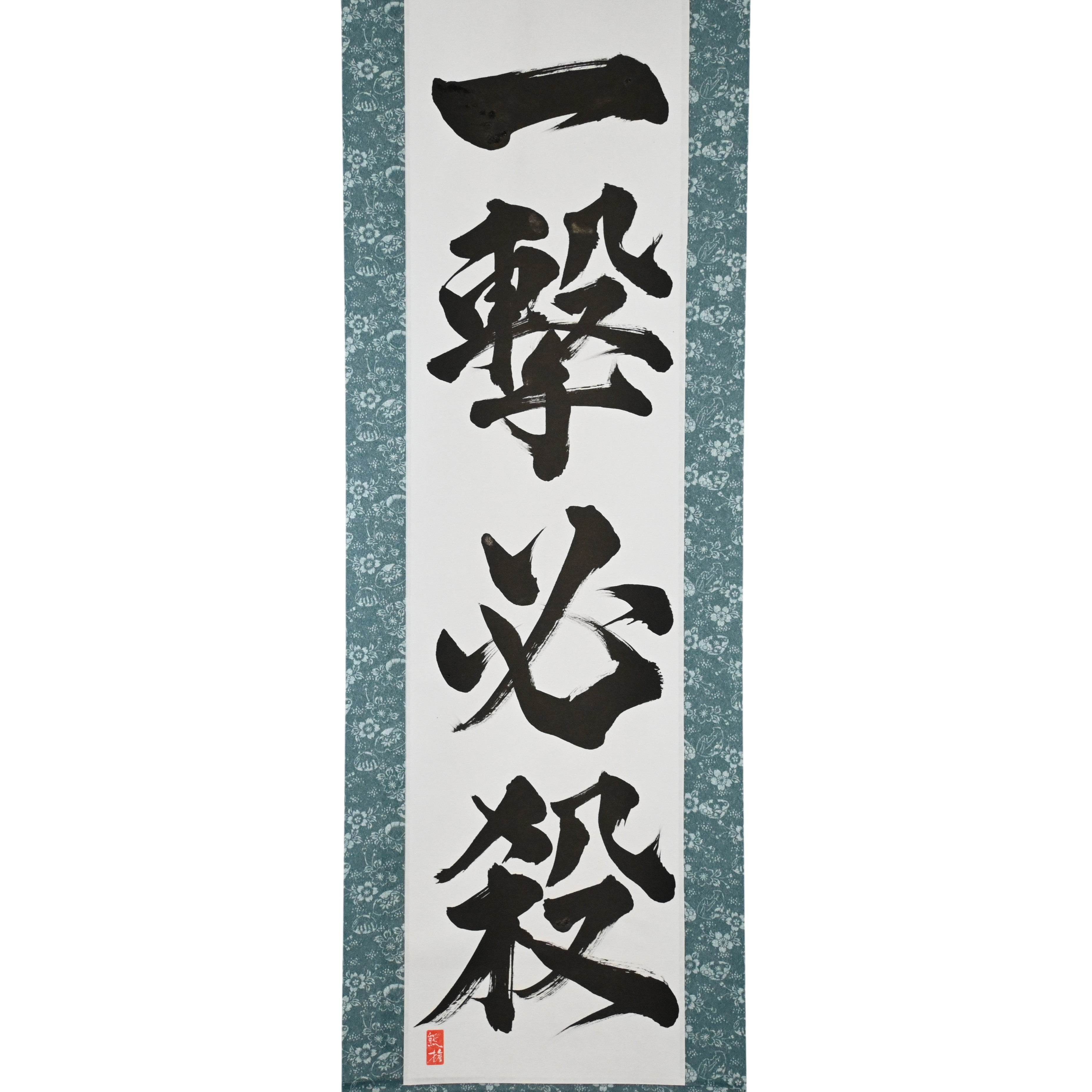 Incarner la philosophie fondamentale du Karaté, ce rouleau de calligraphie japonaise frappant présente la phrase 一撃必殺 (Ichigeki Hissatsu) — signifiant « Un coup, une mort certaine ». Elle reflète l'idéal de délivrer une technique unique, précise et décisive qui met fin au conflit en un instant.