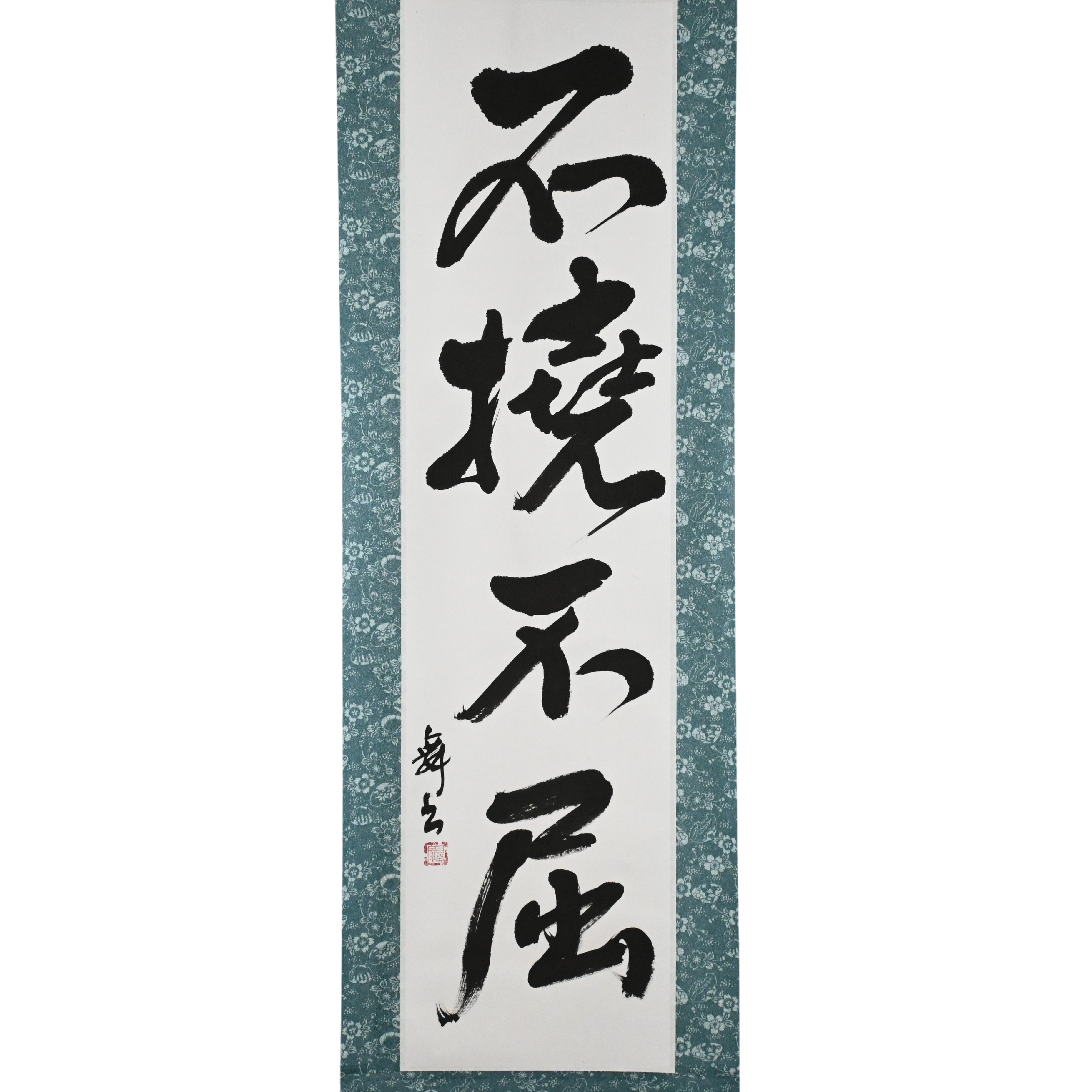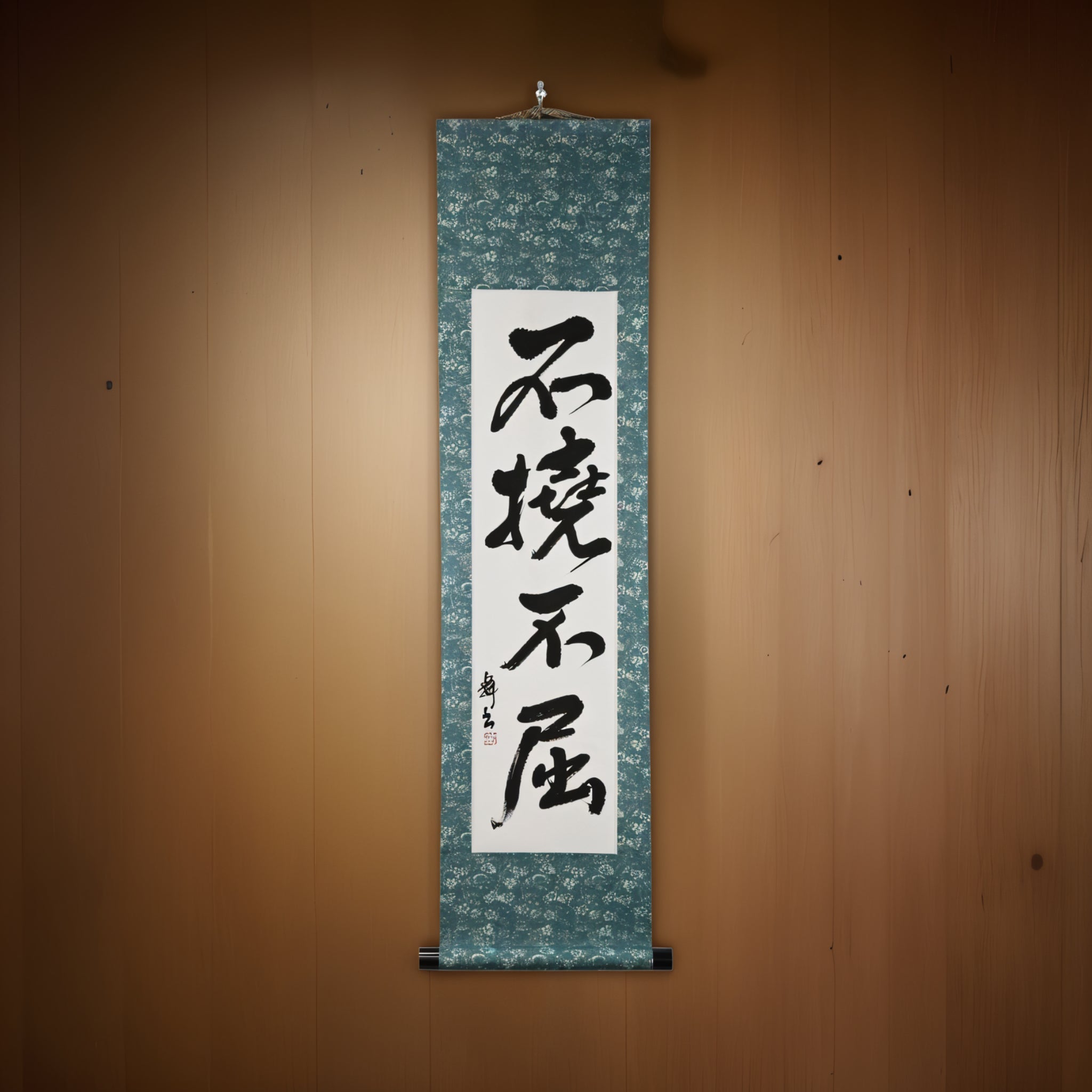 Ce rouleau de calligraphie japonaise présente la phrase audacieuse 不撓不屈 (Futō Fukutsu) — une expression puissante de l'esprit indomptable qui est au cœur des arts martiaux japonais et du code des Samouraïs.