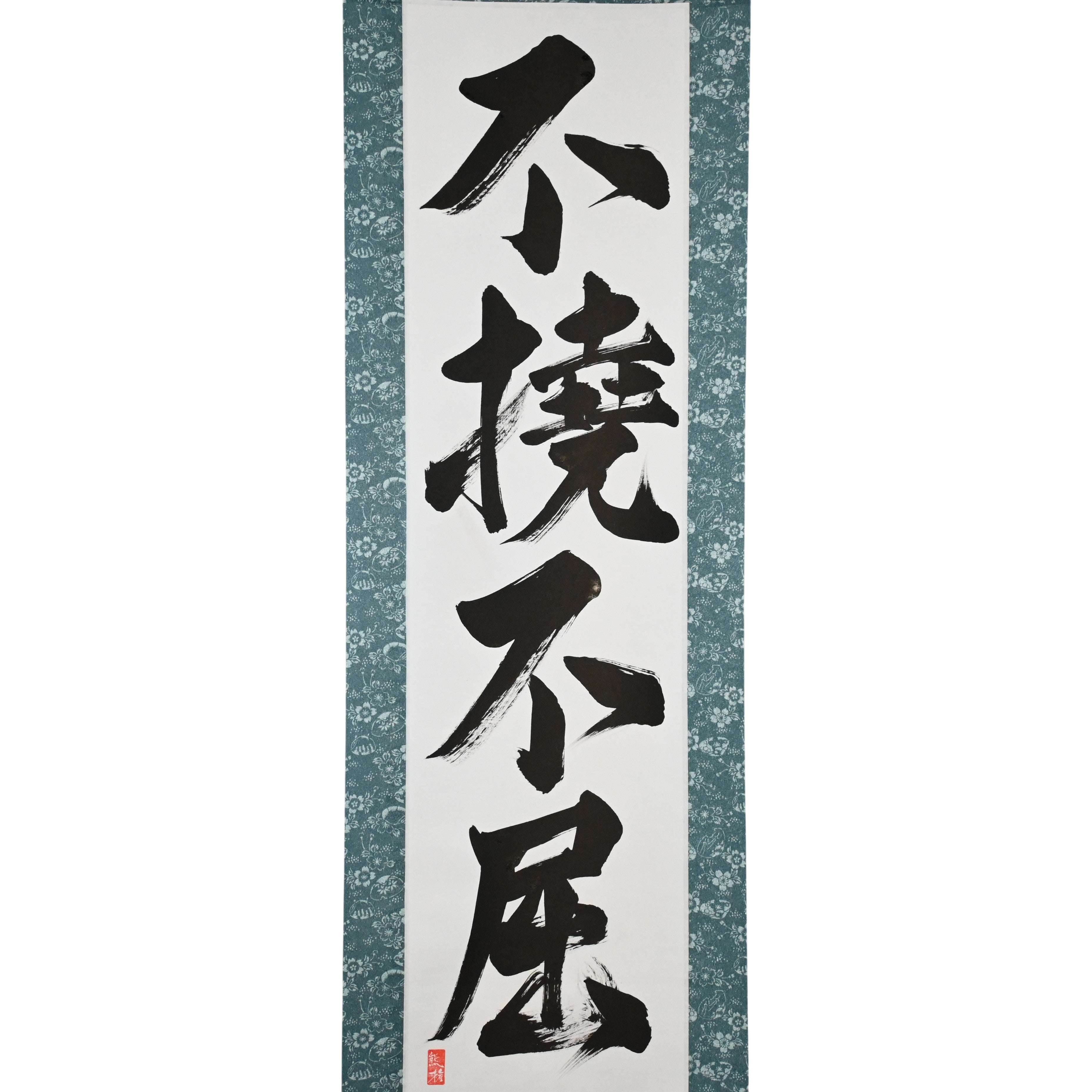 Ce rouleau de calligraphie japonaise présente la phrase audacieuse 不撓不屈 (Futō Fukutsu) — une expression puissante de l'esprit indomptable qui est au cœur des arts martiaux japonais et du code des Samouraïs.