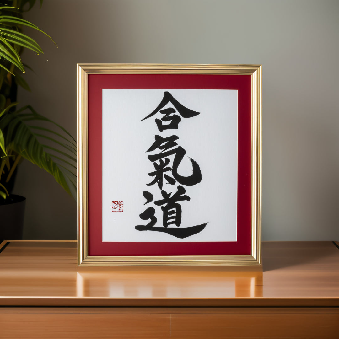 This framed calligraphy artwork features the proud phrase 合気道 (Aikido). It embodies the calm focus, inner strength, and respectful discipline that lie at the heart of Aikido — qualities that guide practitioners in daily life.