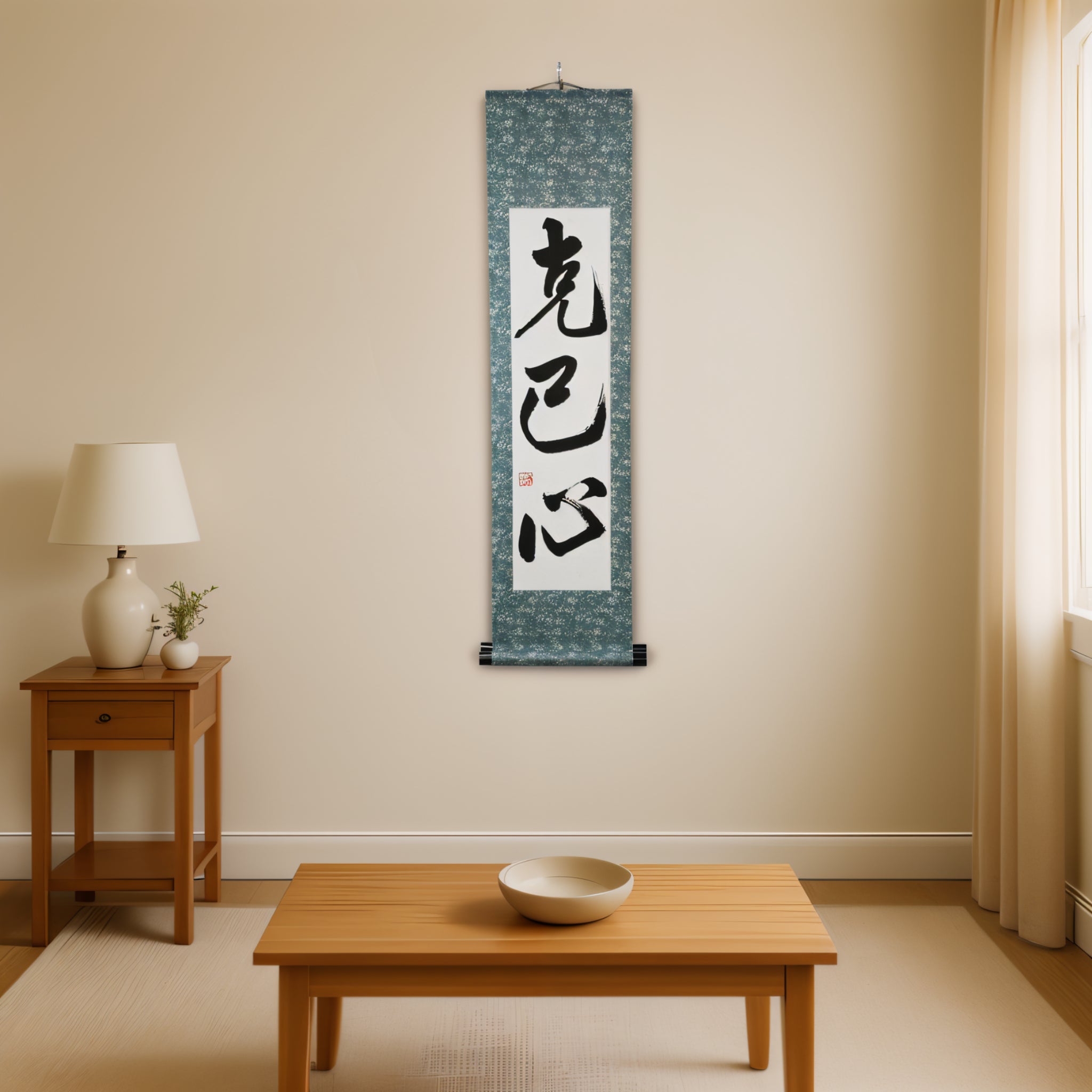 This Japanese calligraphy scroll features the powerful term 克己心 (Kokkishin), meaning "the spirit of self-mastery". It represents a universal principle across Karate, Judo, and Aikido — the idea that the greatest opponent is often within.