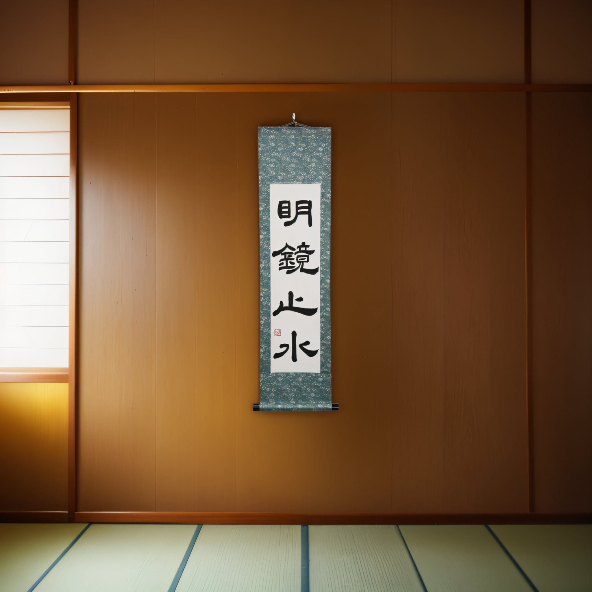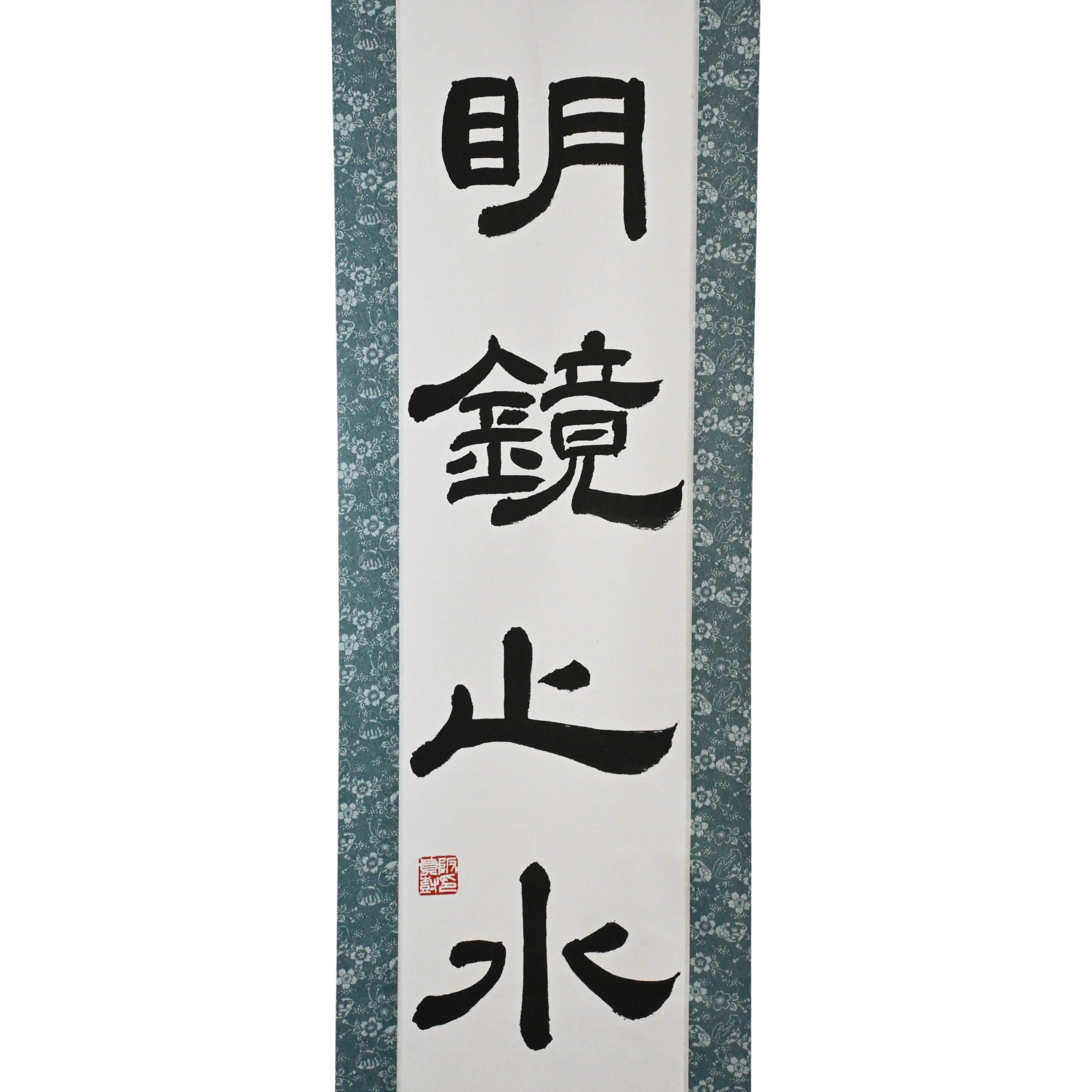 This Japanese calligraphy scroll features the serene phrase 明鏡止水 (Meikyō Shisui) — a state of mind compared to a spotless mirror and a perfectly still body of water. It represents clarity, inner calm, and the quiet strength that arises when the heart is free from noise and distraction.